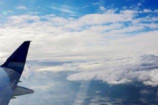 坐在靠窗的机舱里,极目远眺,地上的高楼、山川、河流、树木都渐渐消失在无穷无尽,无边无垠,广袤无限的宇宙太空里。展现在眼前的只是深邃无边,云海茫茫的碧蓝天空。