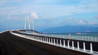 第三次是我们上到人工岛,来到港珠澳大桥口岸。经过多次察访,原来港珠澳大桥是可以到达人工岛口岸的,而且为了方便人们到访,不仅开设了专线观光,而且有公交车直达口岸。这真有点出乎我的意料。找到直达的公交车,奔向口岸。公交车从港珠澳大桥旁的矮桥上跨过,这才解开了我先前的疑虑:原来这不起眼的矮桥是为建设港珠澳大桥而建设的施工专用桥,设计寿命七到十年,如此算来,它的使命即将终结,以后的人们会再也见不上它。车停下,宏伟的建筑映入眼帘,头顶巨大的圆穹,把几座建筑连在一起。坐电梯上到二楼,这里是出发和到达大厅,尤其是东侧的“港珠澳公路大桥口岸”几个醒目的大字,告诉人们,你已经到达港珠澳大桥的起点。另一侧是通向澳门的通道,站在观光台上就可以看到澳门著名的葡京酒店。沿着珠海口岸这一侧,我看到了港珠澳大桥收费站,临到收费站这边,是边检等设施,地面上还根据港澳车辆方向舵的不同,分别设置了左舵右舵标志。从出发到达大厅下来,我们又步行了很长一段路,穿过一个停车场,来到了再也不能进到的警戒线旁,可惜那天起雾了,看得不很清楚。返回的路上,决定徒步从施工便桥上通过。沿着长长的桥面,大约两三公里的样子,在桥的尽头还留着武警值勤的印记。