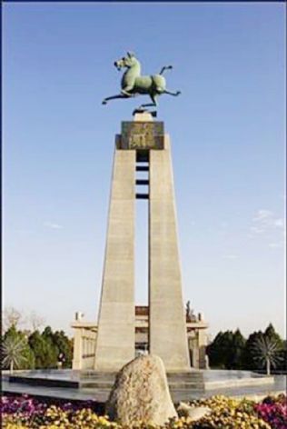 这件雕塑的本尊正是出土于雷台汉墓。1969年,雷台附近的农民们在挖地道时,无意间在大槐树下挖出一座汉墓,墓中出土的200多件文物中,就有这匹铜奔马。铜马三蹄腾空,另一只蹄下踩着一只飞鸟,意出尘外的造型,奇特的受力结构,让这匹马以“马踏飞燕”之名闻名于世,甚至成为了中国旅游的标志。