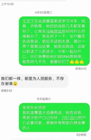4月3日,武利军去庞慧蓝家送衣服,孩子的大伯告知,马峪派出所已多次到他家了解情况,并告知将尽快为其解决户口问题。同日,市户政支队张队长微信告知:派出所已开始搜集材料,进行DNA检验,手续齐备后会很快解决,请放心。