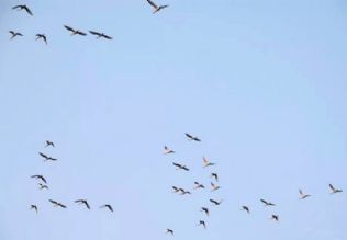 下午5点多,该返程了,天空中突然出现了许多鸟,像赶集似的,有的排成了“一”字形,有的排成“人”字形,有的队伍比较乱,但即便乱,也是有群体观念的,绝不会飞到别的鸟群里。我正纳闷,突然想起陶渊明的“山气日夕佳,飞鸟相与还”,哦,我们要返程了,鸟儿也该归巢了。