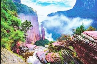 太行巅峰胜境,诗境如画,尽在回龙这一段,它能集中代表南太行风光特色。这里九峰竟秀,峰岳形胜,沟壑纵横,千姿百态。曲境山嶂,百里横亘,红岩绝壁,千尺跌崖,龙口瀑布仙人浣纱,茫茫云海佳境升腾。