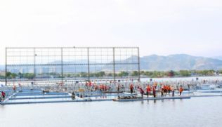 9月20日,施工人员正在加紧安装调试设备,工程已近尾声,东湖水秀喷泉初露真容。