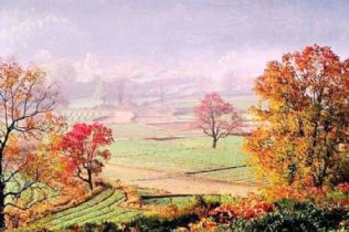 不过,透过那些朱红的乌桕叶,明黄的银杏叶,半青半红的香樟叶,半黄半青的桑树叶,看到沉静在蓝天下的鱼鳞瓦、马头墙、飞檐翘脊、雨迹青苔,窄仄小巷里挑水而过的农夫,身后跟着的大黄狗,还有歇在树上的老母鸡,人家园子里绿意葱茏的白菜莴苣,我还是一下子想起了久远的从前。