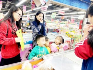 为了让幼儿体验生活,增强社会实践能力,近日,东湖幼儿园组织幼儿去超市参观,并尝试简单购物。图为小朋友拿着购物计划表,寻找自己要购买的商品。