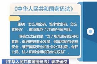 近日,《中华人民共和国密码法》经十三届全国人大常委会第十四次会议表决通过,自2020年1月1日起正式施行,标志着我国在密码的应用和管理等方面有了专门性的法律保障。《中华人民共和国密码法》围绕“怎么用密码、谁来管密码、怎么管密码”,重点规范了5方面44条内容。明确立法目的是“为了规范密码应用和管理,促进密码事业发展,保障网络与信息安全,维护国家安全和社会公共利益,保护公民、法人和其他组织的合法权益”。强调“坚持党对密码工作的领导”,规定“中央密码工作领导机构对全国密码工作实行统一领导”,国家密码管理部门也就是国家密码管理局负责管理全国的密码工作。