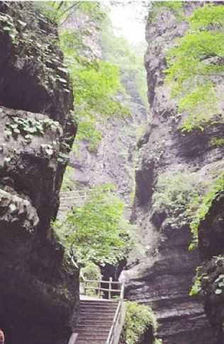 穿过几十米,又现顺势而下的石阶。下至谷底,幽凉环绕,激流冲荡。群峰有的相向,似有所言;有的亲昵凝眸,一线衔天;有的亭亭玉立,如笋若玉,黑漆漆的光泽内藏着万年密码。