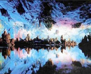在导游的带领下,我们走进了银子岩,如水一般的清凉和平静扑面而来。顿时我仿佛明白了栩栩如生,惟妙惟肖,巧夺天工,由衷地赞叹大自然的神奇和灵秀。银子岩的钟乳石奇形怪状,在各色灯光的照射下,一根根石笋就象缀满了银粉,白的象一块块玉石,红的似一簇簇珊瑚,绿的若一片片翡翠,黄的如一颗颗琥珀……灯光与天然的石笋融为一体,好一个人间仙境!穿行在银光四射,熠熠生辉的石府中,我再一次深刻地领悟到“银子岩”3个字的由来。岩洞中有老、中、青、幼4种不同年纪的钟乳石,老的色泽苍黄,中青年的则白里透黄,色泽明艳,幼年的则银白如玉,难怪人称“四世同堂”呢!