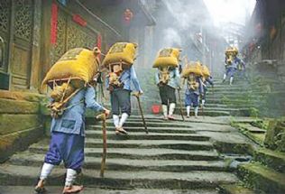曾经,云梯街上日夜行走着一些背负沉重盐包的脚夫,那是古镇永不泯灭的记忆了。他们低眉顺眼,身着蓝布大褂,打着绑腿,肩扛生活的重担,一步一个脚印,发出低沉的号子,一任汗水打湿了脚下的石板街。实在口渴了,便到千脚泉旁舀一瓢甜井水,一气儿灌下,再掏出干粮填肚子,稍事休息。他们须将上百斤的忠县川盐或丝绸、蜀绣等天府特产,沿着云梯街,一级一级往上,背至山巅,又沿三尺宽的盐运古道,背往湖北恩施、利川、来凤一带,全程300多公里,是宋代著名的陆运交通线。回程则捎上湖北的桐油、漆器等楚地商品,销往川蜀各地。那时的西沱就是长江上游一个重要的深水良港,是“川盐销楚”的陆路启运点与货物集散地,热闹非凡。为了抢夺盐运生意,招徕往来商旅,越来越多的客栈老板和盐商,便在江边建房开店铺,随山势向上,鳞次栉比,最终成就了“云梯街”这一独特的长江奇观。
