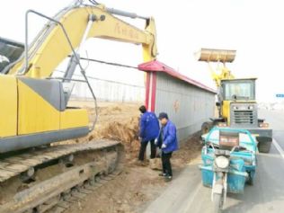 为配合康培公司高标准绿化241县道沿线,3月15日,孟封镇组织人员和机械,对道路两侧涉及到的建筑物进行拆除。图为孟封镇拆除西堡村迎春壁。