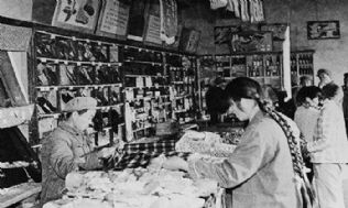 十字街口,其实南北的道路方向是错开的,南面的路靠东,北面的路靠西,供销社在十字街口东北面,南北一溜高高的建筑,地基很高,有两个门,西门和南门,南门是正门,门上面墙壁用水泥抹了,油漆刷了的“发展经济、保障供给”八个大字远远地就能看见,中间是红红的五角星。供销社可谓是“麻雀虽小,五脏俱全”。柜台东西分开、一排排,木头结构,玻璃罩面。商品分为几个区域,针织布料、日用百货、衣服鞋帽、文化用品、钟表、自行车、缝纫机等等。柜台里墙壁上毛主席语录“为人民服务”、“勤俭节约”到处可见。在计划经济时期,买什么都需要票,粮票、肉票、布票等等,没有票,拿着钱也买不到。印象中,似乎是卖布的柜台最大,那时候人们一般是自己做衣服,成匹的各色布料码在墙架上,摆在柜台上,甚是壮观。柜台上摆着一个个算盘,那是售货员必需的工具。人们买了东西,到拐角处结账,空中有交叉的供售货员来回传递票据,“唰、唰”的声音,非常方便。