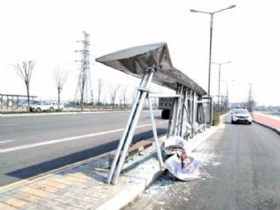 日前,位于307国道清徐段的一处公交候车亭被撞毁,候车亭顶棚内的支撑立柱以及广告灯箱受挤压全部变形,灯箱玻璃碎了一地,受损十分严重。司机在肇事后逃离现场。