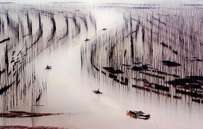 到霞浦,必到小皓。那里阳光照耀下的金黄沙滩、不断亲吻着沙滩泛着天空湛蓝的海浪,必会使你如痴如醉,流连忘返。只有当你真的亲眼看到阳光下的金色海水,才知道这段描述是真的。小皓的摄影者是真的多。也许我们是设备最简陋的。金色大海,让人移不开眼。近一点,一半海水一半沙滩滩涂。滩涂上清楚地看到高高的海带架子。在高处观景台拍完以后,师傅送我们去底下玩耍一番。来个架子的近景特写,阳光赋予了沙滩别样的生命。