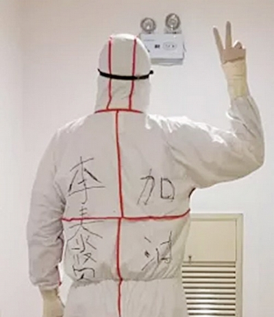 图片中这位就是李继勇儿子暨作者李峰的背影。作者作为一名父亲,在“疫线”奋战时——后背上所写的名字李泰贤,则是李继勇之孙李峰的儿子。今年儿子李泰贤参加中考,这是作者作为父亲专门写给儿子,并让同事拍下来,传给他勉励其加油,同时也带着对儿子的祝福,在战疫中奋勇前行的珍贵定格!
