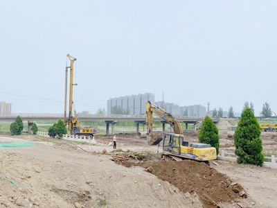 西关大桥为西关大街北延工程跨越白石河而设。本桥全长120m,桥梁分两幅,全宽51m,中心桩号为K0+125,上部结构采用6-20m装配式预应力砼简支小箱梁,右前夹角为69度;下部结构桥台采用肋板台,桥墩采用柱式墩,墩台均采用钻孔灌注桩基础。景观方案采用不对称斜拱形成桥梁造型,主拱高于桥面52.737m,副拱高于桥面32.085m。滨河北路在该桥第六跨下穿。