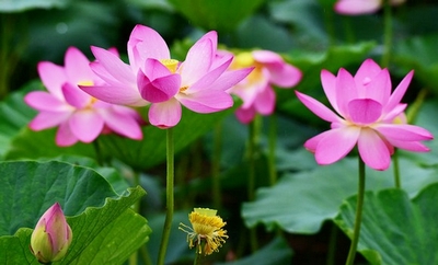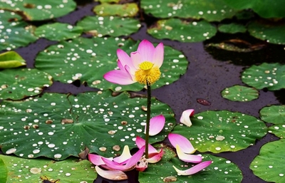 荷花又名君子花、六月红、莲花、菡萏、芙蕖、水芝等。因其仙姿丽质,品格高雅,成为历代诗人歌咏不息,芸芸游客赞不绝口的对象。从最早的《诗经》“山有扶苏,湿有荷华。”“彼泽之陂,有蒲菡萏。”到周敦颐的《爱莲说》“出淤泥而不染,濯清涟而不妖。”屈原的《离骚》“制芰荷以为衣兮,集芙蓉以为裳。”再到李白的《折荷有赠》“涉江玩秋水,爱此红蕖鲜。攀荷弄其珠,荡漾不成圆。佳人彩云里,欲赠隔远天。相思无因见,怅望凉风前”;杨万里的“接天莲叶无穷碧,映日荷花别样红。”“小荷才露尖尖角,早有蜻蜓立上头。”都把荷花作为高洁拔俗精神的象征,咏赞不掇,给人以无尽的美的享受。