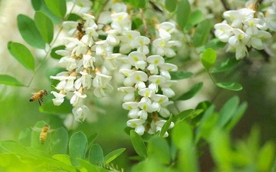 书上说,槐树在每年的四月、五月开花,六月、七月结实,可今年的花期好像姗姗来迟,七下八上中伏才见到它这少女般的美丽模样。家家乐超市广场周围被众多槐树环绕,北面的那几棵特别引人注目,它们枝繁叶茂,相互拥抱,雪白的花蕾象一串串透明的水晶珍珠从枝叶间垂吊下来,朵朵如花似玉,争奇斗艳,令人陶醉。我踮起脚尖,试想着拽过一束放在脸上,可我还来不及亲吻一下,就被那成群结队的蚂蚁盯上,它们齐刷刷窜到了我的胳膊上,让我防不胜防。这下我可亲自体验了“蚂蚁缘槐夸大国”典故的含义,还有《红楼梦》第十六回凤姐诉说在大观园里“指桑骂槐”,咄咄逼人的怨委惆怅。