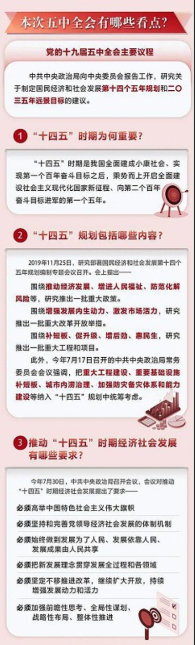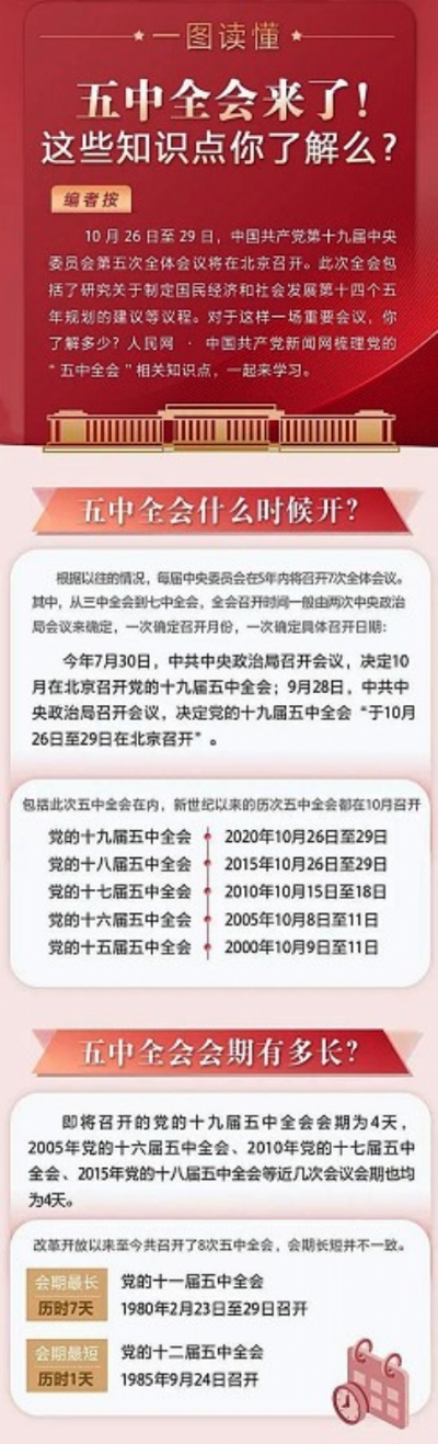 中国共产党第十九届中央委员会第五次全体会议于2020年10月26日上午在京召开。中央委员会总书记习近平代表中央政治局向全会作工作报告,并就《中共中央关于制定国民经济和社会发展第十四个五年规划和二O三五年远景目标的建议(讨论稿)》向全会作了说明。