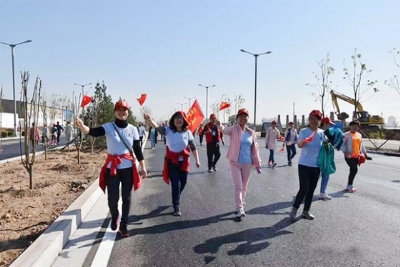 紫林路宽敞整洁,洒水车一早就将地面清洗得干干净净。在亮丽的天空下,空气湿润,没有一丝灰尘,让人神清气爽。主持人优美清晰的播报声从台上喇叭里传来,徒步活动启动仪式正式开始了。台前各单位职工队伍整齐地排列着。队旗下,整齐划一的小红帽,轻巧鲜艳的小国旗,红的黄的蓝的队服,一眼望不到边。开枪令呯然而发,所有徒步的队伍像一条被刺激的巨型大蟒,瞬间头脑清晰,辨清前进的方向后,向西快速蠕动着。我和同事们挤在人群里,摩肩接踵不能快速向前,看到隔离带对面的路上行人较少时,我拉起同事的手快步跨过隔离带,抄有空隙的路走去,随着人流昂首摆臂疾步向前走。此时,我们心无旁骛地踩着自己行走的节奏向前,向前!