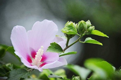 初冬的一天早晨,木槿花开了。只见两朵硕大的花朵绽放,鲜艳的玫红色的花瓣,像丝绸做成,同样玫红色的五支雄蕊骄傲地露在顶端,而金黄色的雌蕊羞涩地躲在它的下面。那花的颜色,好像浓一点、淡一点都不行,是那么鲜艳,那么和谐。就连一片完成使命,即将走向新生的黄叶也在烘托着这和谐的气氛。