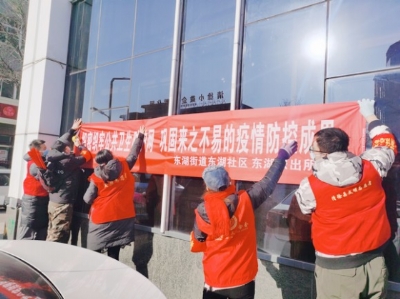 本报讯1月9日上午,东湖社区与县志愿者协会工作人员,冒着凛冽寒风在辖区主要街道、公共场所等地张贴疫情防控标语、悬挂横幅。