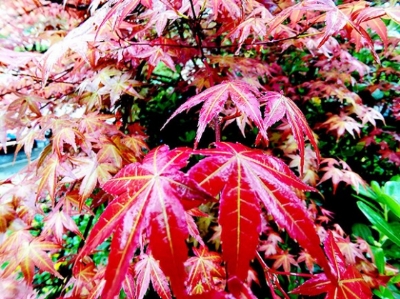 我雨中漫步在紫金港河畔的小路上,被绿树丛中火红的枫叶感染。雨中的红枫叶展示着靓丽的色彩,每一片枫叶,每一个枝头,都喷涌着炽热的情感,迸发出朝气蓬勃的生命旋律,是那样的坚毅、勃发向上的精神!