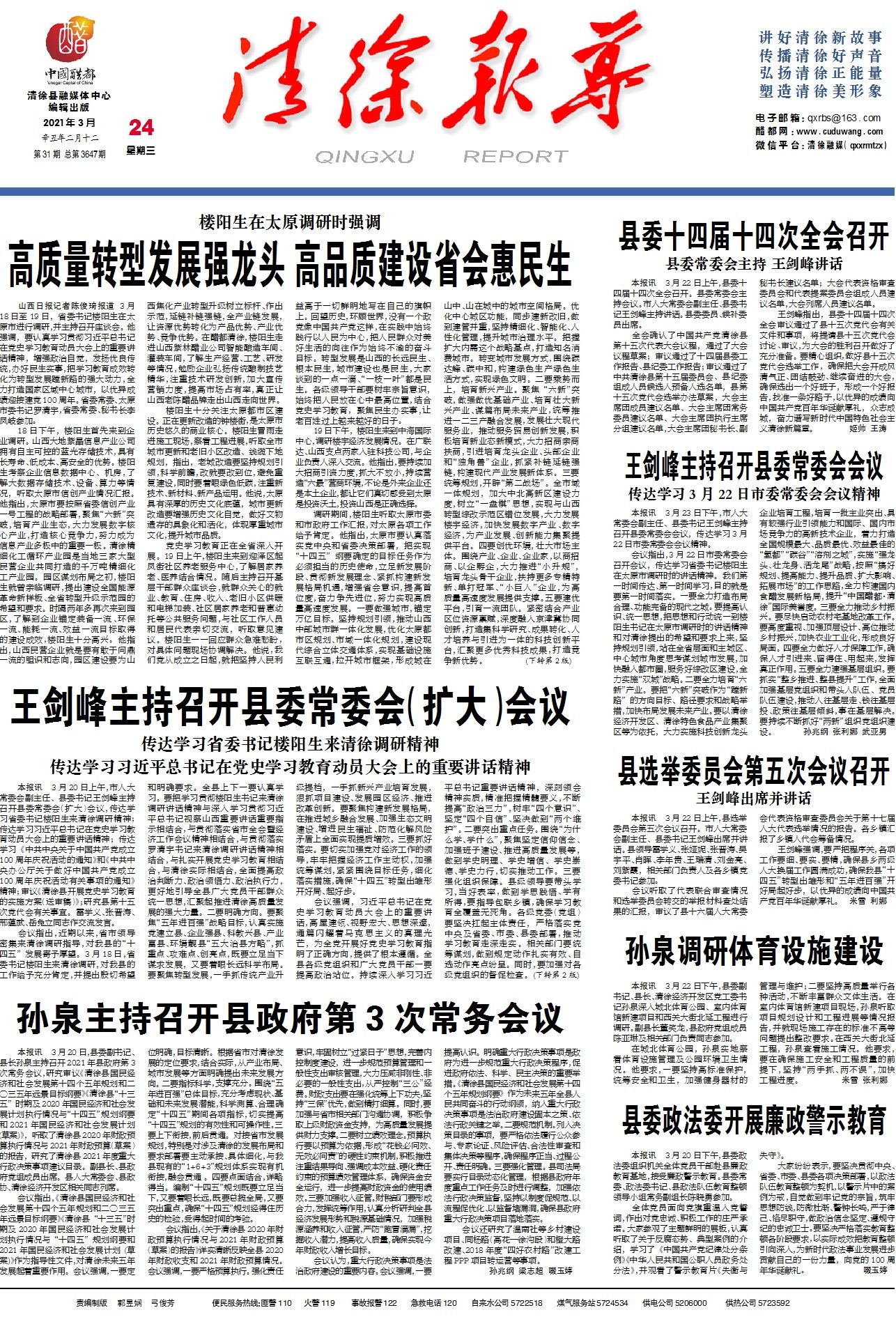本报讯3月20日,县委副书记、县长孙泉主持召开2021年县政府第3次常务会议,研究审议《清徐县国...