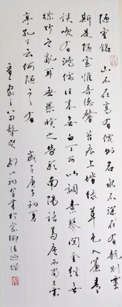 他“饱囊千山险”,又“掠来万水咽”,将毛主席“万水千山只等闲”的灵气天成诗文,书写成娴熟流畅的恢宏巨献,其间劳作之辛苦,功力之奥妙,决非一般人所能及。纵观全卷,他的楷书以圆笔为主,兼之方笔,使作品端庄自然,顿挫得当。隽拔刚断,墨韵酣畅,笔势章法,很具楷书之真谛。显然,郝振铎先生将毛主席铿锵的诗魂,用他那纵擒自如的书法,抒发得淋漓酣畅,清秀挥洒,真可谓锦上添花,美不胜收。期待郝振铎先生佳作尽早问世,以慰读者心扉。