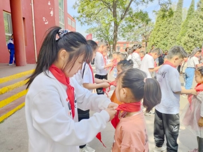 接着,老队员们把红领巾戴在新队员的胸前。在庄严的队旗下,全体新少先队员高高举起右手进行了庄严宣誓。