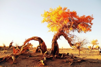 落日余晖下,车停人聚,远远地看到了胡杨矗立在黄沙里,有的三株两株长在沙漠里,有的独树一帜,有的无数棵胡杨连成一片,它们都有着斑驳粗壮的树杆,婀娜多姿的树枝,黄绿错综的繁密的树叶。老树枯干无枝无叶,静静地立在葱郁的胡杨树旁,倒下的枯干深深地插在沙漠里。这或许就是“三千年的守望”:生千年而不死,死千年而不倒,倒千年而不朽。