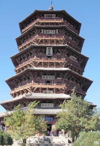 应县木塔全名为佛宫寺释迦塔,座落在山西省朔州市应县县城内西北角的佛宫寺院内,是佛宫寺的主体建筑。建于辽·清宁二年(1056年),金·明昌六年(1195年)增修完毕,至今已有960余年的历史了。它是我国现存最古老、最高大的纯木结构楼阁式建筑,是我国古建筑中的瑰宝,也是世界木结构建筑的典范。它与法国的艾菲尔铁塔、意大利的比萨斜塔,并称为“世界三大奇塔”。1961年,被国务院列入第一批全国重点文物保护单位。