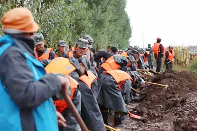 黑浪起时绿浪涌 橄榄长城护堤村 灾情就是敌情 一腔热血敢抛洒 何惧泥寒水深