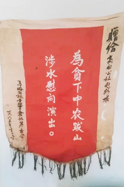 第二天,大队干部、四清工作队的同志及全村父老乡亲为我们送行。同时,拿出一面手工刺绣的锦旗,隆重地赠送我们。这面锦旗可称百家旗,几块花布及边料都来自好几家。旗上绣着:赠高白公社电影队,“为贫下中农跋山涉水慰问演出”。都是老大娘小媳妇一针一线绣出来的。