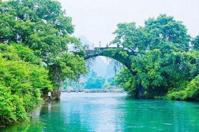 遇龙河是广西桂林市阳朔县的一条河。这条河常年水质清澈,水流缓缓。河流两岸峰清秀迤逦,形态万千,岸边绿草如茵,翠竹葱郁,树木繁茂。而后我们又到桂林千古情景区,观看了千古情大型民族歌舞演出。舞台上,每一个节目登场,都在歌颂我们伟大的祖国和壮美无比的桂林山水以及这里的风土人情。表演结束,我们又随导游游览了千年古榕、独木成林的大榕树风景区。