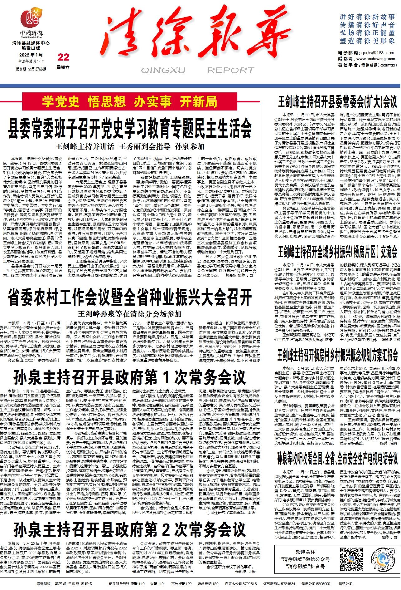 本报讯1月20日上午,县委副书记、县长、清徐经济开发区党工委书记孙泉主持召开2022年县政府第2...