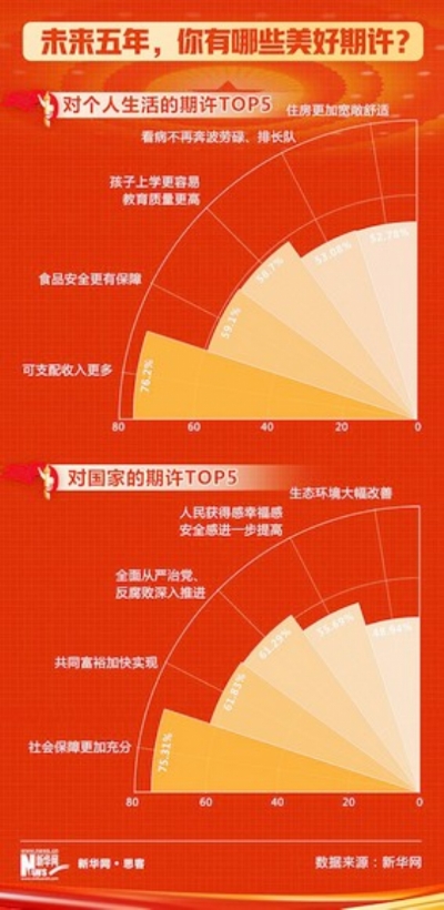 2022全国两会调查,折射出国家发展与个人幸福之间的同频共振。展望未来五年,个人对未来的期许涵盖收入增加、食品安全、子女教育、医疗与住房保障等方面。人民群众对获得感、幸福感和安全感的期待,在调查中得到充分体现。同时,网民对国家未来五年的期许中,“社会保障更加充分”“共同富裕加速实现”“全面从严治党,反腐败深入推进”等期许受到广泛关注,与网民对个人的期待相互映衬,互为依托。