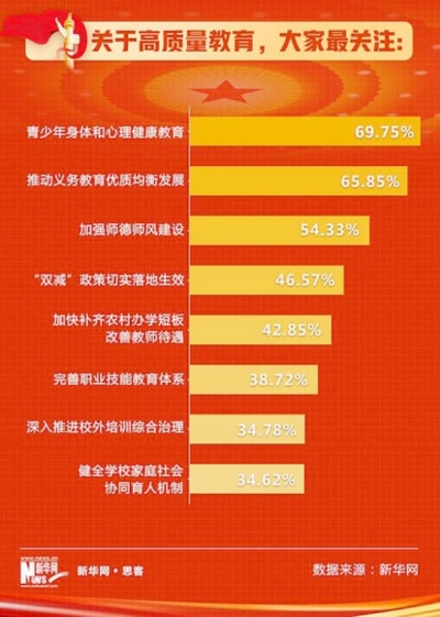 青少年身体和心理健康教育,被网民视为重中之重。调查显示,69.75%的网民认为高质量教育,首先要关注青少年体质,重视心理健康。有网民认为,孩子的身心健康成长,是家庭与民族的殷切期望。此外,“推动义务教育优质均衡发展”“加强师德师风建设”“‘双减’政策切实落地生效”等议题,也是网民关注的重点。