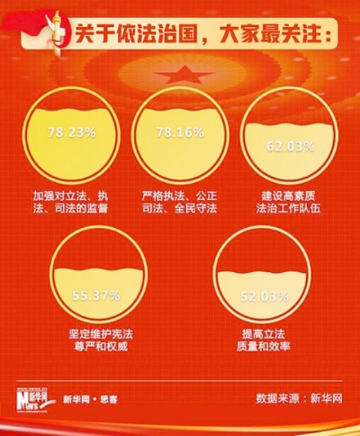 法治观念更加深入人心,网民期待全面依法治国的步伐更坚实。调查显示,近八成网民期待“切实加强对立法、执法、司法工作的监督”“深入推进严格执法、公正司法、全民守法”。这一结果,展现出网民对法治中国建设的关注与期待。有网民称,一个现代化国家,必然是法治国家,建设法治国家,离不开我们每个人的努力,愿全面依法治国的脚步坚实有力。