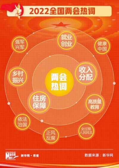 调查显示,反映民生期待的热词位居榜单前列。2022全国两会热词中,收入分配、住房保障、高质量教育、就业创业等热词备受网民关注,反映了人民对美好生活的向往与期待。综合对比近年新华网两会调查数据,收入、住房、就业等一直是网民关注的焦点议题。网民期待代表委员带来更多、更具体的议案和提案,进一步补短板、解难题、兜底线。