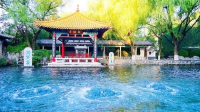济南自古称泉城,有72名泉,趵突泉名列众泉之首,是济南的象征与标志。趵突泉位于市中心,占地158亩。当你来到这里,首先看到的是碧绿清澈的一潭湖水,周围是石砌的台阶和栏杆。湖边的观澜亭金壁辉煌,“趵突泉”与“第一泉”石碑分立两侧。抬头是艳阳高照的天空,低头是清澈透明的泉水,四周是古朴典雅的亭台楼阁,再加上绿树环绕,使这里的风景更加秀丽宜人。特别神奇的是湖中的泉水,三窟鼎立,喷涌而出,发出“咕嘟、咕嘟”的响声,不断翻滚,昼夜不停,蔚为壮观。一池泉水生机勃勃,在阳光的照耀下,更加光彩夺目。游人在此观泉花四溅,赏周围美景,感叹大自然的神奇,并纷纷拍照留念。导游讲:如果到了寒冷的冬天,由于泉水温度常年保持在18℃左右,这时的趵突泉泛起白雾,景色朦胧,构成一幅奇妙的人间仙境。“趵突腾空”为济南八景之一,所以人们说,游济南不看趵突泉,就不算来过济南。