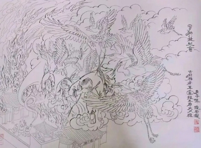 这时候,是上演神仙上场救灾救难的时候了,于是只有发生在电影电视里的神仙剧在杨房营村上演了,一只只“水老鸦”从东西两边天空中飞来,遮天蔽日,无法估数,它们口中含着河水,飞到龙王庙上空时把水吐出来,一部分掉头再去取水,一部分一头栽下来,含住被困者的衣衫,或两三只一组,或五六只一组,把被困者叼出火区,放置在安全区域。
