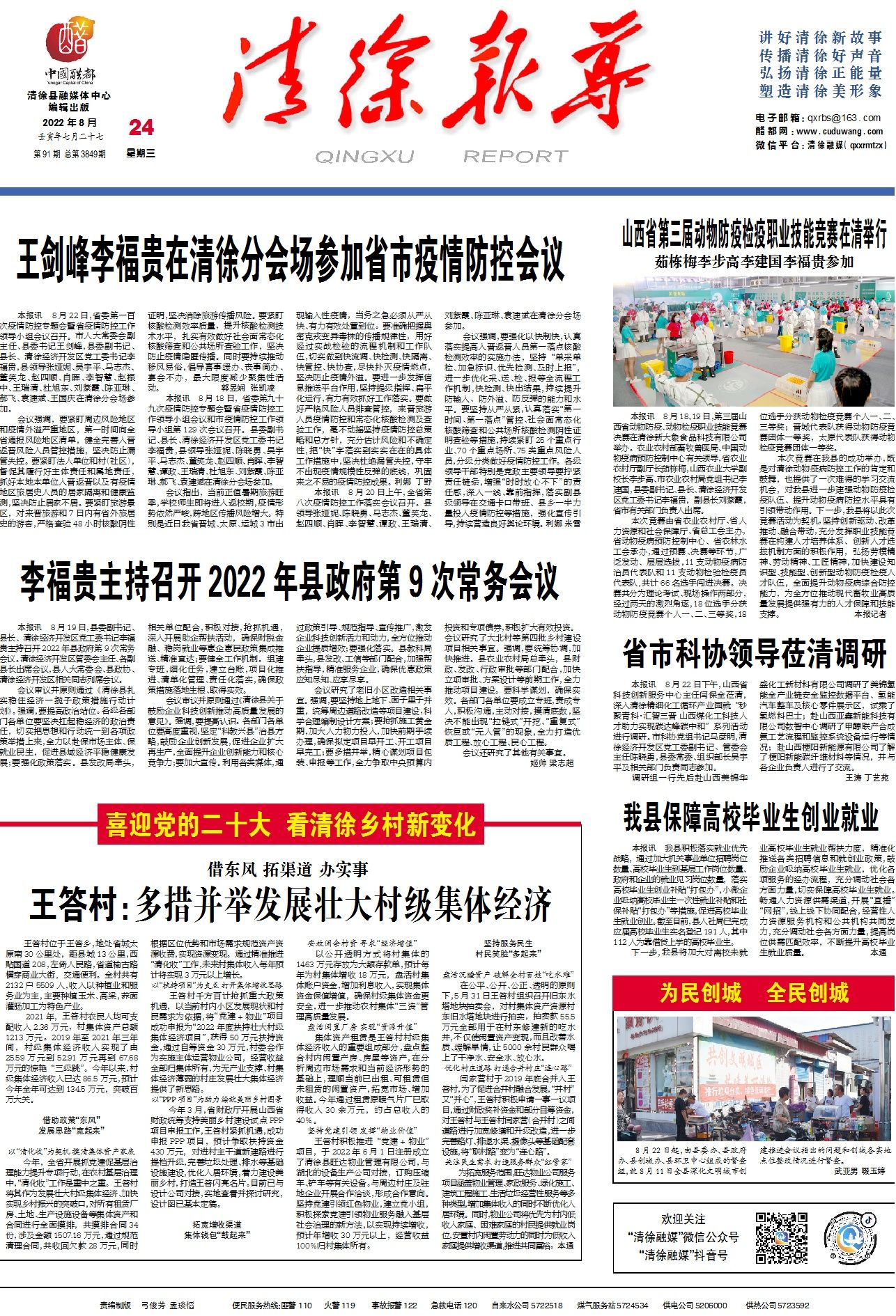 本报讯8月19日,县委副书记、县长、清徐经济开发区党工委书记李福贵主持召开2022年县政府第9次...