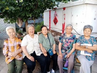 树上山楂红彤彤,树下一群老姐妹,读书看报谈新闻,说说笑笑又健身。过去苦难度人生,如今最美夕阳红,喜迎党的二十大,小区楼院合个影。