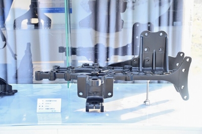 “一种载重汽车的左前接梁”以降本增效、减少环境危害为指导,将6个产品进行轻量化整体设计,材料采用三高能源自主研发的高强度球铁(QT900-6),废钢熔炼球铁新技术,并对铁水成分合金化,材料性能达到抗拉强度≥900.屈服强度≥600,远高于普通铸钢ZG310-570抗拉强度≥570,屈服强度≥310的材料限值,且比重为铸钢的90%,实现以铁代钢的突破。产品以先进铁模覆砂铸造工艺成型,以数控、加工中心精密加工,经超声波清洗后进行水基型电泳漆处理,保障装配精度尺寸和零部件的表面防锈蚀能力,在提高安全性能的同时,实现降重40%,且整体采用镂空式设计,去掉多余材料,在轮廓尺寸为800*400*440的尺寸范围内,由主体壁厚平均10mm的肋连接17个外径40、内径17、厚度45的圆柱安装孔,通过对周边不同功能零部件进行集成,一体化设计,简化了安装工艺,弥补了多个功能系统依靠多个产品连接的不足,减少了汽车装配时间,安装工人劳动强度降低30%,生产效率提高20%。