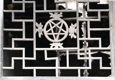 花窗之所以至今还在边山一带的老房子中散布着,是因为这里的人们重宅基,爱老屋。边山的古村落的老屋深宅,窗户棂格有其独特的一面。庞家的三合院除正房堂屋外,东西房的棂格花饰别开生面,既有常见的万字不到头——万字不到头由多个万字(卍)联合而成,其中“万字”寓意吉祥,“不到头”寓意吉祥连绵、万寿无疆,又有他处不多见的囍字、寿字棂格。主人说此院建造于民国初年,我们在象征长寿、富贵的寿桃、牡丹棂格上见到了五角星的民国印证。
