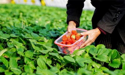 近日,记者走进清泉山庄草莓采摘区,棚内绿意盎然、暖意融融,丰收气息迎面而来。走进大棚内,在绿叶白花间,一排排垄起株苗上结满了红润多艳的草莓,让人垂涎欲滴,小朋友们穿梭在田间,找准枝条上颗粒饱满、鲜艳欲滴的草莓,小心翼翼地将它摘下,放进自己的篮筐里。随着篮筐里的草莓逐渐增多,采摘的成就感也油然而生。