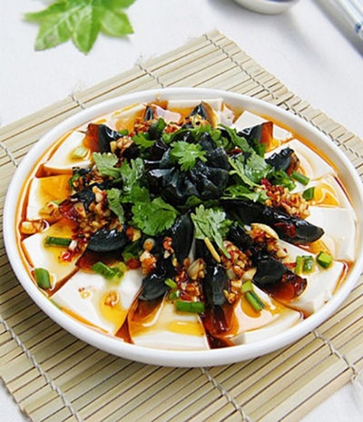 2.皮蛋剥皮后一分为四,然后摆在豆腐的四周。