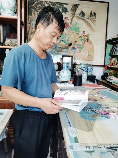 从十四五岁开始学画,杨雨雷已经在手工技艺这一行摸爬滚打将近四十年,屋内墙上挂的都是他自己绘制的作品。他擅长工笔重彩人物画,又特别取向于古农耕文化、古民俗文化创作,这也和他的农民身份脱不开关系。随着农村生活水平的提高,农业生产力也大幅度提升,许多过去的生产农器具被大型现代机械取代,甚至许多农村小孩都分不清马、牛、驴、骡。这些满是乡愁的农村生活的记忆,也日益被岁月冲淡甚至快要被淘汰。值此春节喜庆之际,作为农民艺术家、省级工艺美术大师的杨雨雷默默告诫自己,一定要把这些曾经伴随多少人长大的念想留住,通过自己的创作,也让未来孩子们能认识传统民俗文化,农耕文化,这是一种责任,更是一份使命与担当。