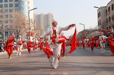2月5日,元宵节,2023年清徐县元宵节民间文艺展演盛大开演。来自全县的12支队伍4000余名“演员”为全县人民献上一场欢庆祥和的民间文艺盛宴。国家级非遗南狮、绛州鼓乐、华阴老腔、安塞腰鼓、太重锣鼓等应邀助兴演出。图为陕西安塞翔云锣鼓艺术团的安塞腰鼓表演。