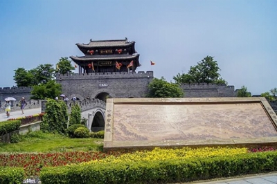 参观完台儿庄大战纪念馆,已经是下午4点半了。我们快步来到运河桥边,只见河水碧波荡漾,两岸绿树成荫,漂亮的画舫船顺河滑过。游人纷纷举起相机、手机,拍下这难忘的景色。然后,我们从西门进入台儿庄古城。西门也叫“台城旧志”,意思是旧城的标志。台儿庄大战期间,曾经是孙连仲的临时指挥部,后毁于战火。今天看到的西门,是2011年重建的。为了登高远望,我们爬上了城楼。当年乾隆皇帝第4次下江南时,在天后宫登岸,接受地方官员的朝拜,并御笔亲题“天下第一庄”5个大字,如今,显赫地挂在西门的城楼上。古城的大街前面有一座“水陆通衢”牌坊,它展现了此地重要的地理位置,见证了台儿庄往日的繁荣。旁边的水门叫安澜门,是进入古城的水上通道。有了这一通道,城内的水街水巷,与京杭大运河的主航道实现了连通。